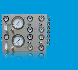 Luchtbord / Duikpaneel voor de voorziening van lucht van meerdere duikers. Met dit paneel kunnen meerdere gassen door elkaar gemixt worden. |